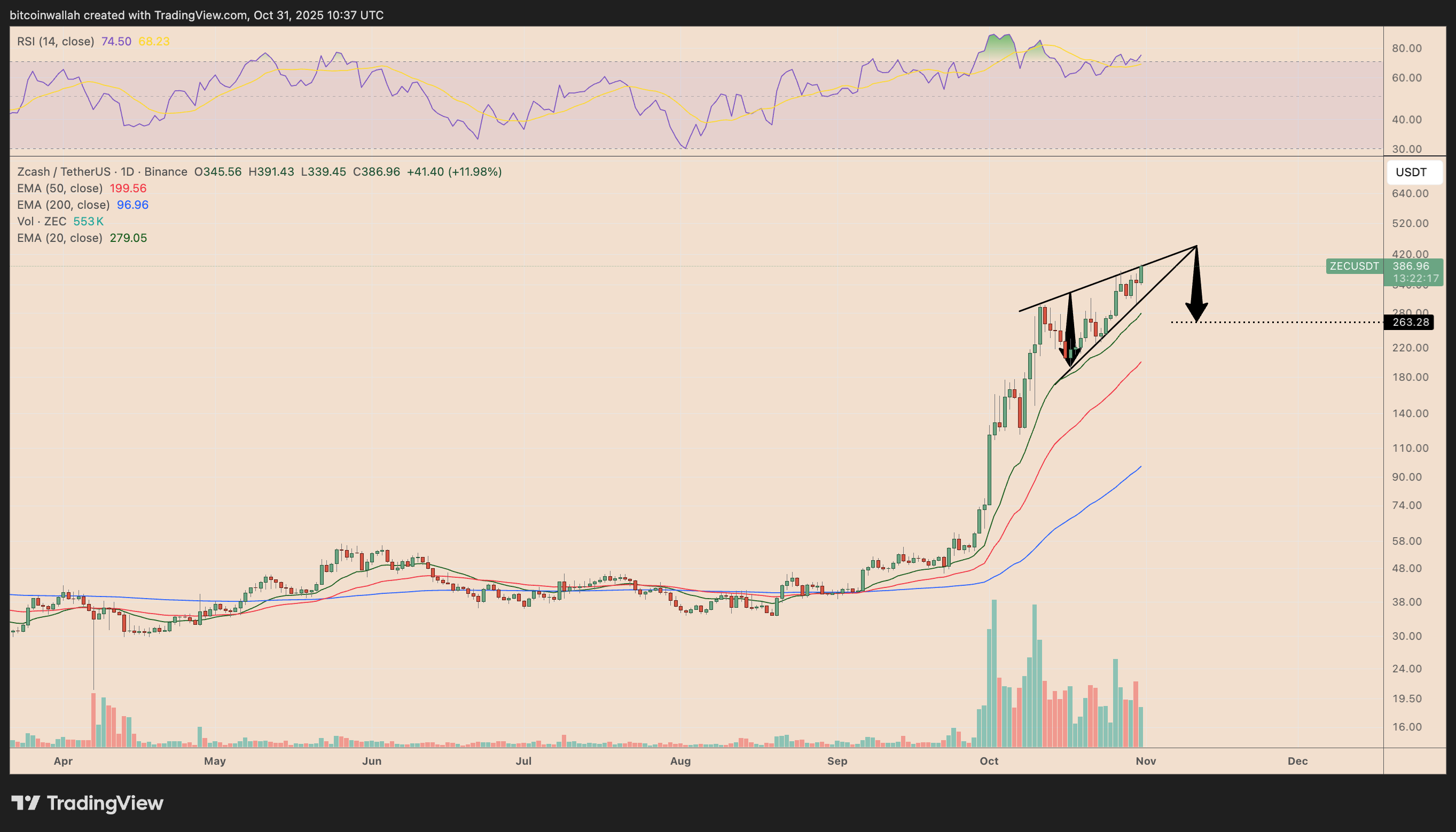 Bu formasyon, satıcıların ZEC’i takozun alt trend çizgisinin altına itmesi halinde kasım ayında 260–270 dolar bölgesine kadar yüzde 30’luk bir düşüşü doğrulayabilir.