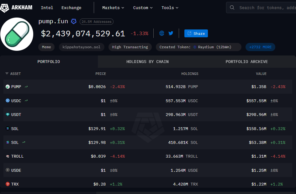 Blockchain veri platformu Arkham’a göre Pump.fun etiketli kripto para cüzdanı hala yaklaşık 855 milyon dolar değerinde stablecoin ve 211 milyon dolar değerinde Solana (SOL) tokeni bulunduruyor.