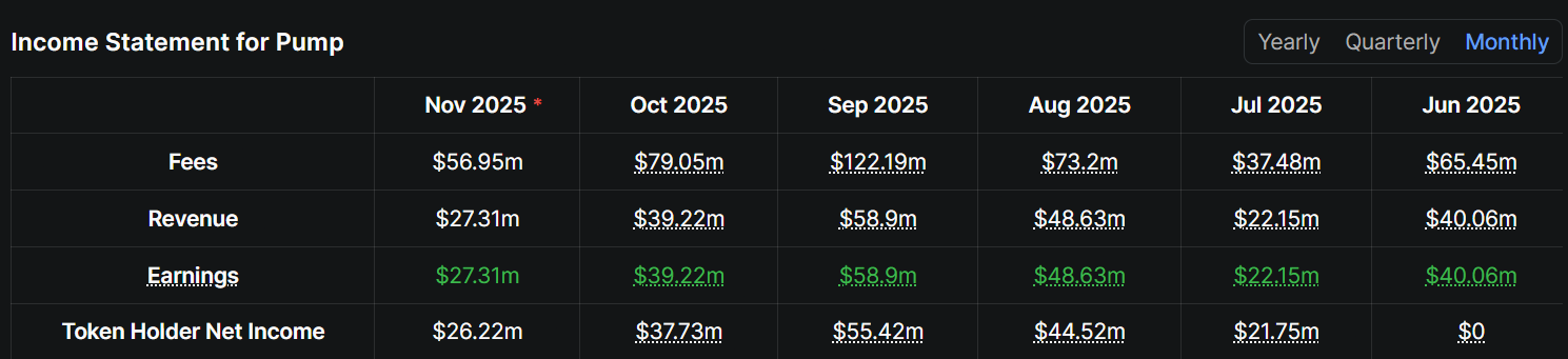 Pump.fun’ın aylık geliri temmuzdan bu yana ilk kez 40 milyon doların altına düştü ve DefiLlama verilerine göre kasım ayında 27,3 milyon dolara gerileyerek eylül ayındaki 58,9 milyon dolardan yüzde 53 düşüş yaşadı.