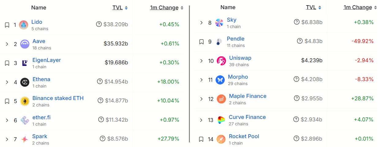 Ethereum’un TVL büyümesindeki olumlu örnekler arasında, sentetik stablecoin protokolü Ethena son 30 günde yüzde 18 artarken, borç verme ve stablecoin getirilerine odaklanan DeFi platformu Spark’ın yatırımları yüzde 28 arttı. Öte yandan, Pendle getiri platformundaki TVL yüzde 50 düşerken, borç verme platformu Morpho’daki yatırımlar yüzde 8 azaldı.