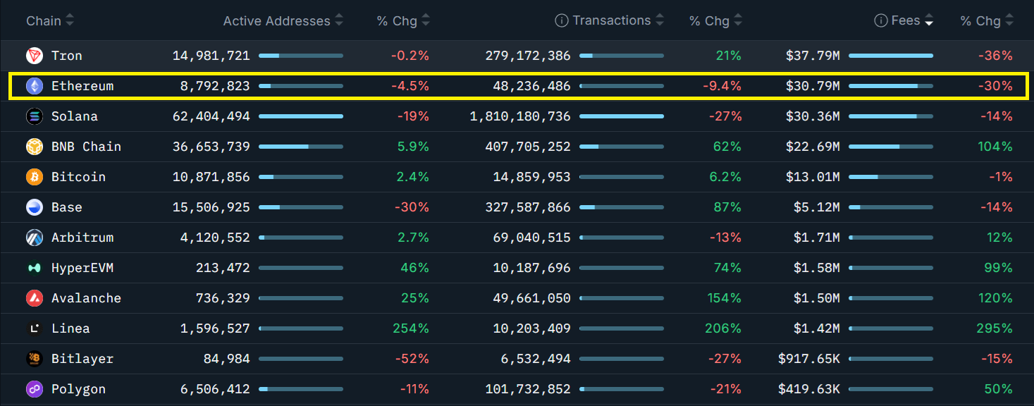 Ethereum’un ağ ücretleri geçen ay yüzde 30 düşerken, işlemler yüzde 10 azaldı. Buna karşılık, BNB Chain, Avalanche ve HyperEVM’de ücretler ikiye katlandı ve aynı dönemde işlem sayıları yüzde 60 veya daha fazla arttı. Ethereum akıllı sözleşmelerine yapılan yatırımlar ay boyunca yüzde 5 artsa da yatırımcılar rakiplerin istikrarlı bir şekilde farkı kapattığından endişe ediyor.