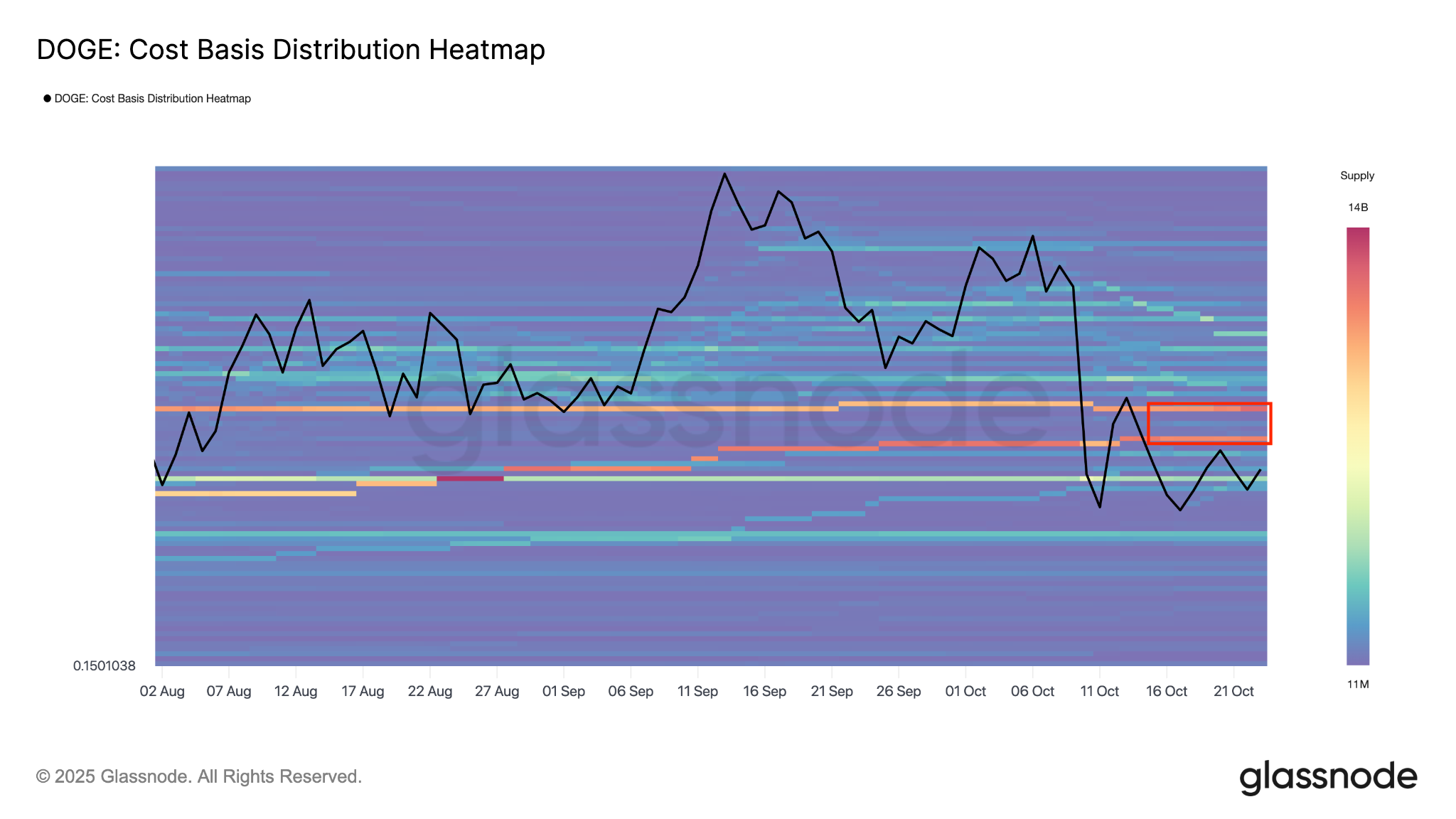 Glassnode’un dağıtım ısı haritası, arzın önemli bir kısmının 0,20–0,21 dolar aralığında yoğunlaştığını gösteriyor. Yaklaşık 24,9 milyar DOGE bu seviyede yakın zamanda edinildi, bu da bu bölgenin önemini vurguluyor.