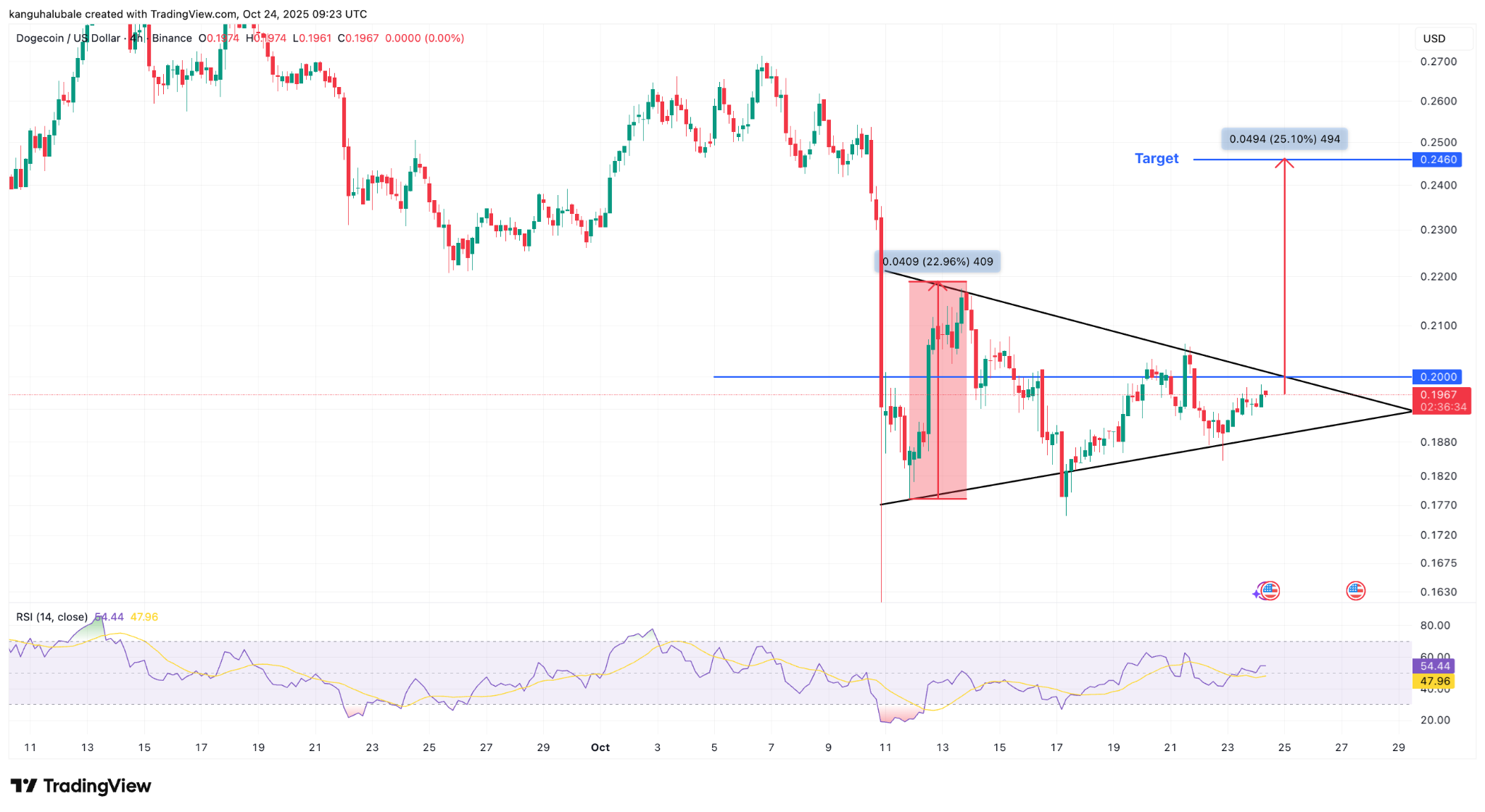 DOGE fiyatı, 0,25 dolara kadar kazanç elde etmek için simetrik üçgen formasyonunu doğrulamalı.