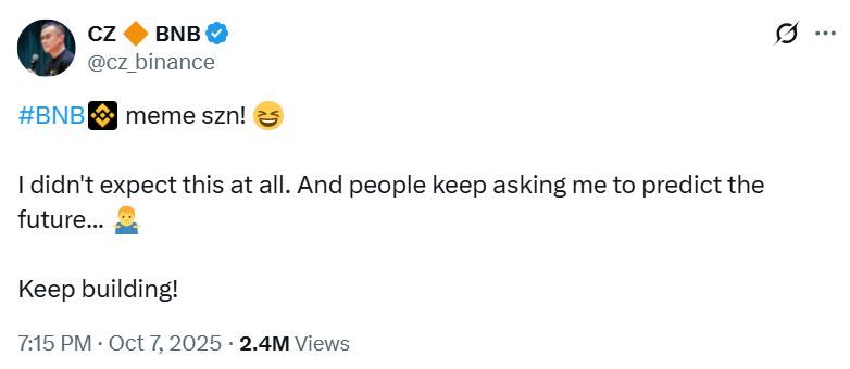 Blockchain üzerindeki artan yatırımcı faaliyeti, Zhao’nun “hiç beklemediğini” söylediği “BNB meme sezonu” olarak adlandırdığı fenomeni tanımlamasıyla sektörde dikkat çekti.