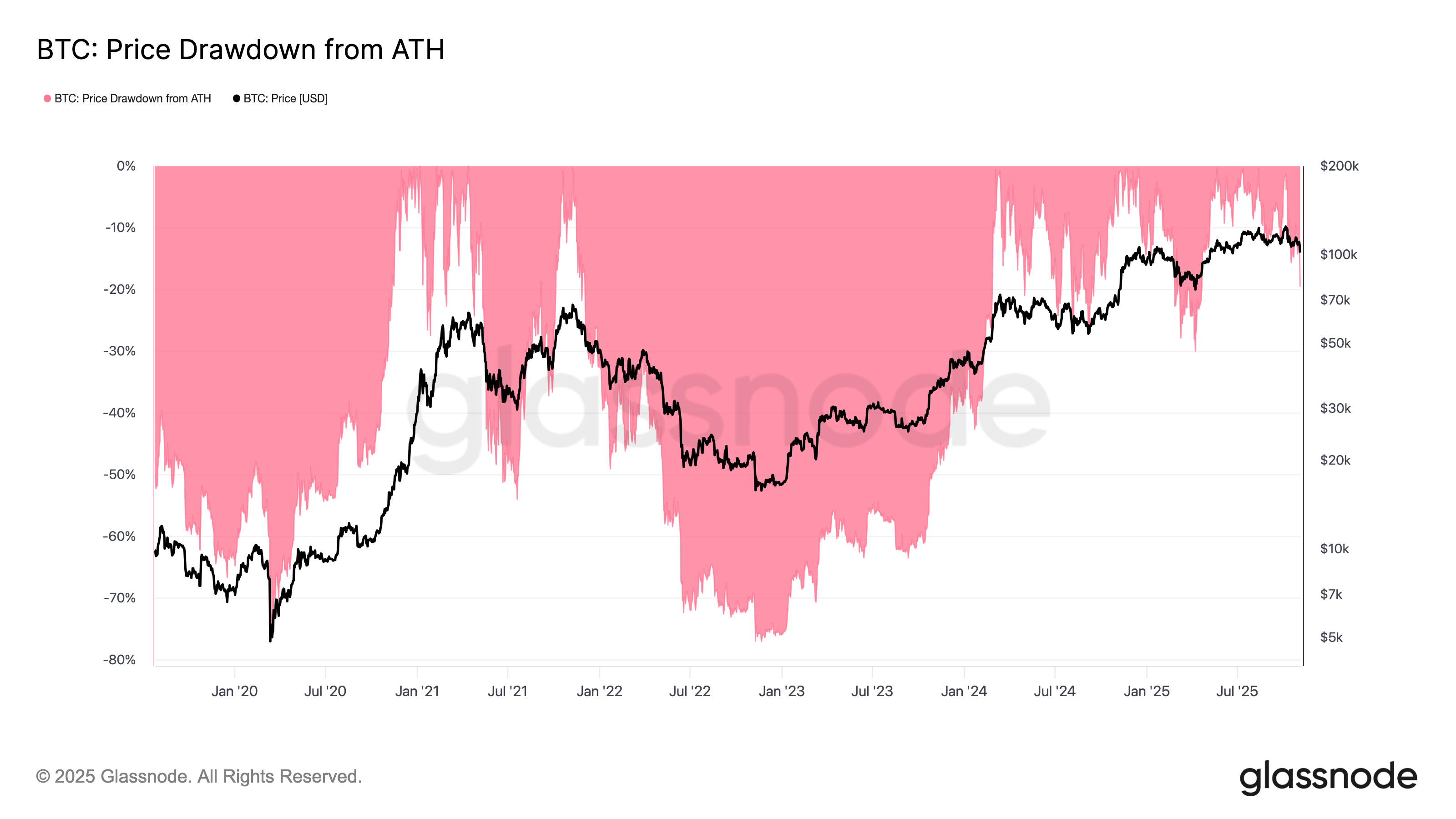 Tüm zamanların en yüksek seviyelerinden Bitcoin fiyat düşüşleri. Kaynak: Glassnode
