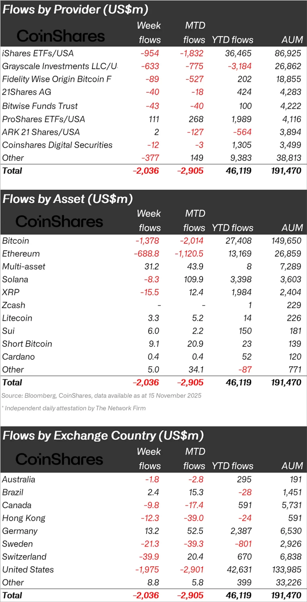 Bu durum Bitcoin, Ethereum ve altcoin fonlarına da yansırken Coinshares haftalık kripto para raporunu yayınladı ve geçtiğimiz hafta 2 milyar dolarlık çıkış yaşandığını söyledi.