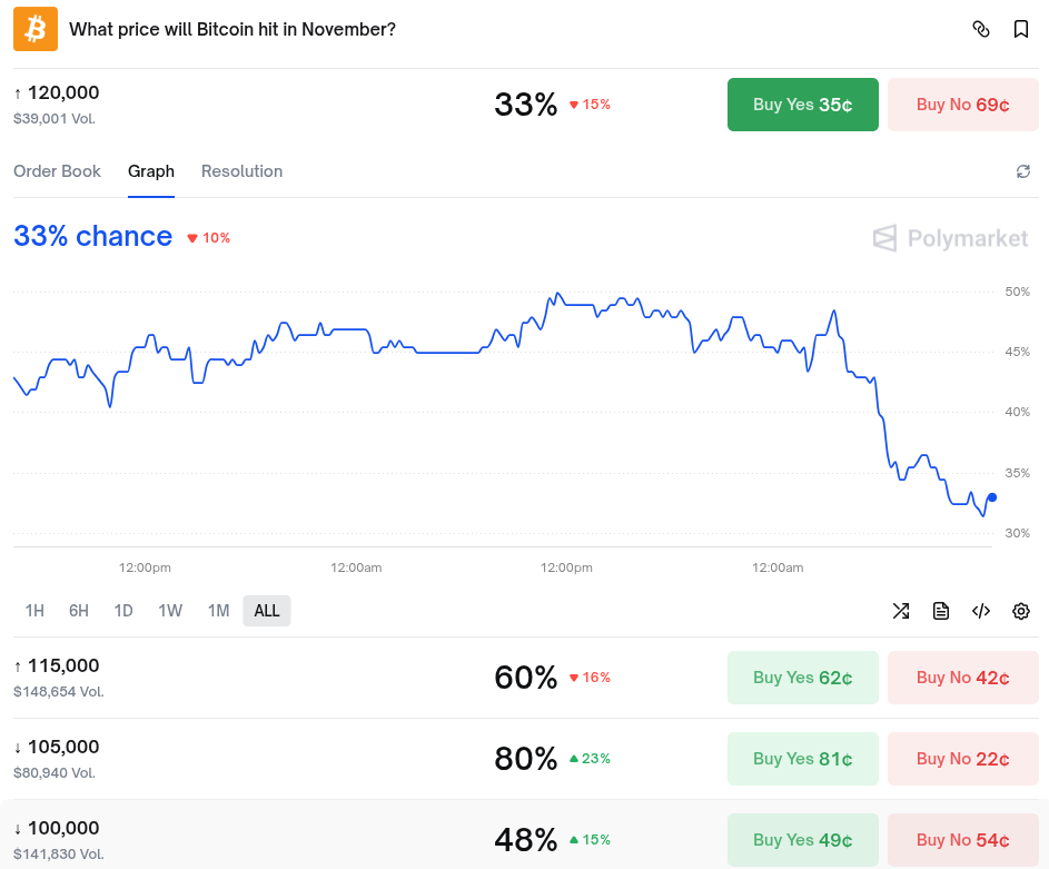 Tahmin piyasaları, kripto yatırımcılarının mevcut düşük duyarlılığını vurguluyor. Polymarket, BTC/USD’nin ayı 120.000 doların üzerinde bitirme olasılığını yalnızca yüzde 33 olarak belirledi; 115.000 dolar için bu oran yüzde 60.