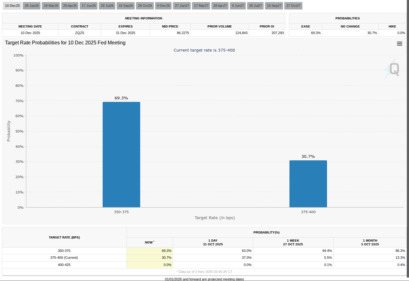 CME Group’un FedWatch Tool verilerine göre, Fed’in aralık ayındaki bir sonraki toplantısında faiz indirimi olasılığı yüzde 63.