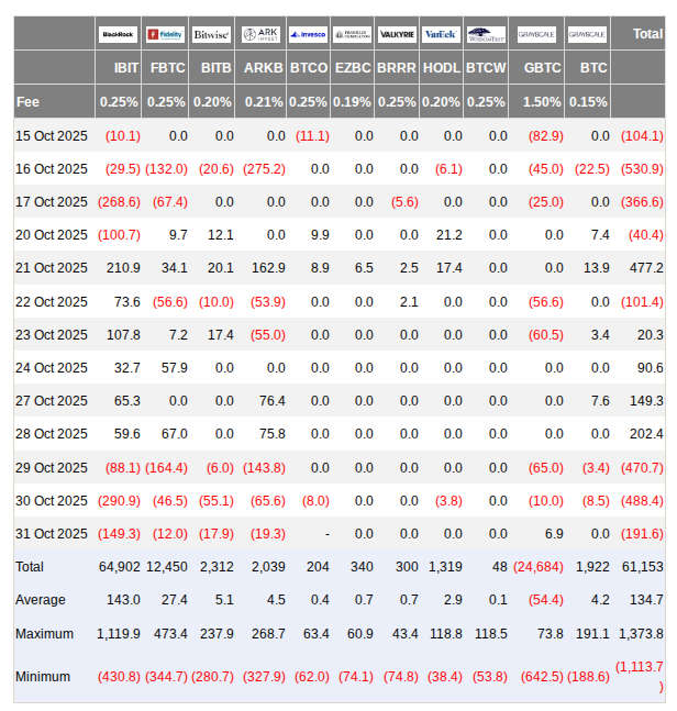 Birleşik Krallık merkezli yatırım şirketi Farside Investors verileri, 31 Ekim’e kadar ABD spot Bitcoin borsa yatırım fonlarından (ETF) üç gün üst üste net çıkışlar yaşandığını gösteriyor.