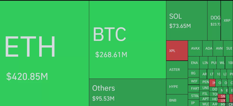 Piyasa çapında likidasyonlar son 24 saatte 1.1 milyar doları aştı. Bunun 1.03 milyar dolarlık kısmı long pozisyonlardan, 72.3 milyon dolarlık kısmı ise short pozisyonlardan geldi. En büyük likidasyon ETH’de görülürken (420.85 milyon dolar), Bitcoin’de 268.61 milyon dolar, Solana’da ise 73.65 milyon dolar tasfiye gerçekleşti.