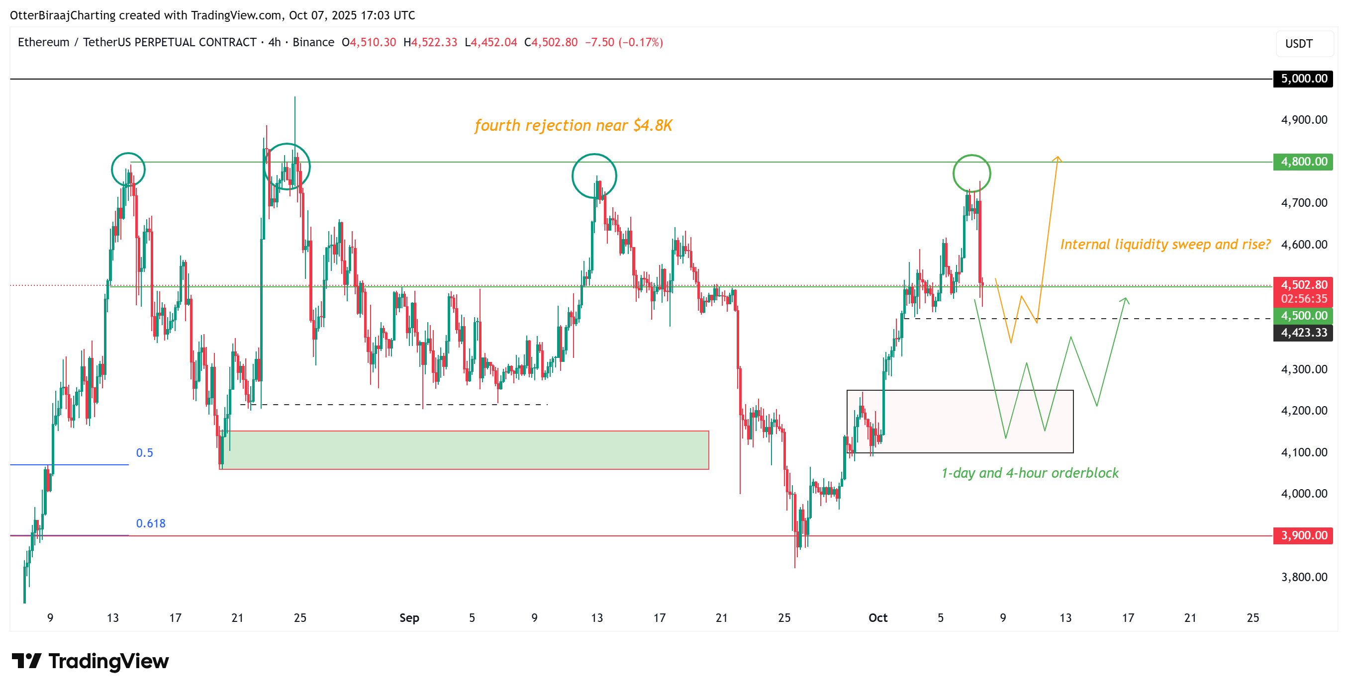 Kripto yatırımcısı Skew, son rallinin 4.700–4.800 dolar bölgesine “dördüncü dokunuşu” işaret ettiğini belirtti. ETH bu bölgeyi koruyabilirse “bu oldukça yükseliş sinyali olur.” Aksi halde, daha derin bir geri çekilme daha yüksek bir dip oluşturabilir ve potansiyel olarak bir sonraki yükseliş ayağını hazırlayabilir.