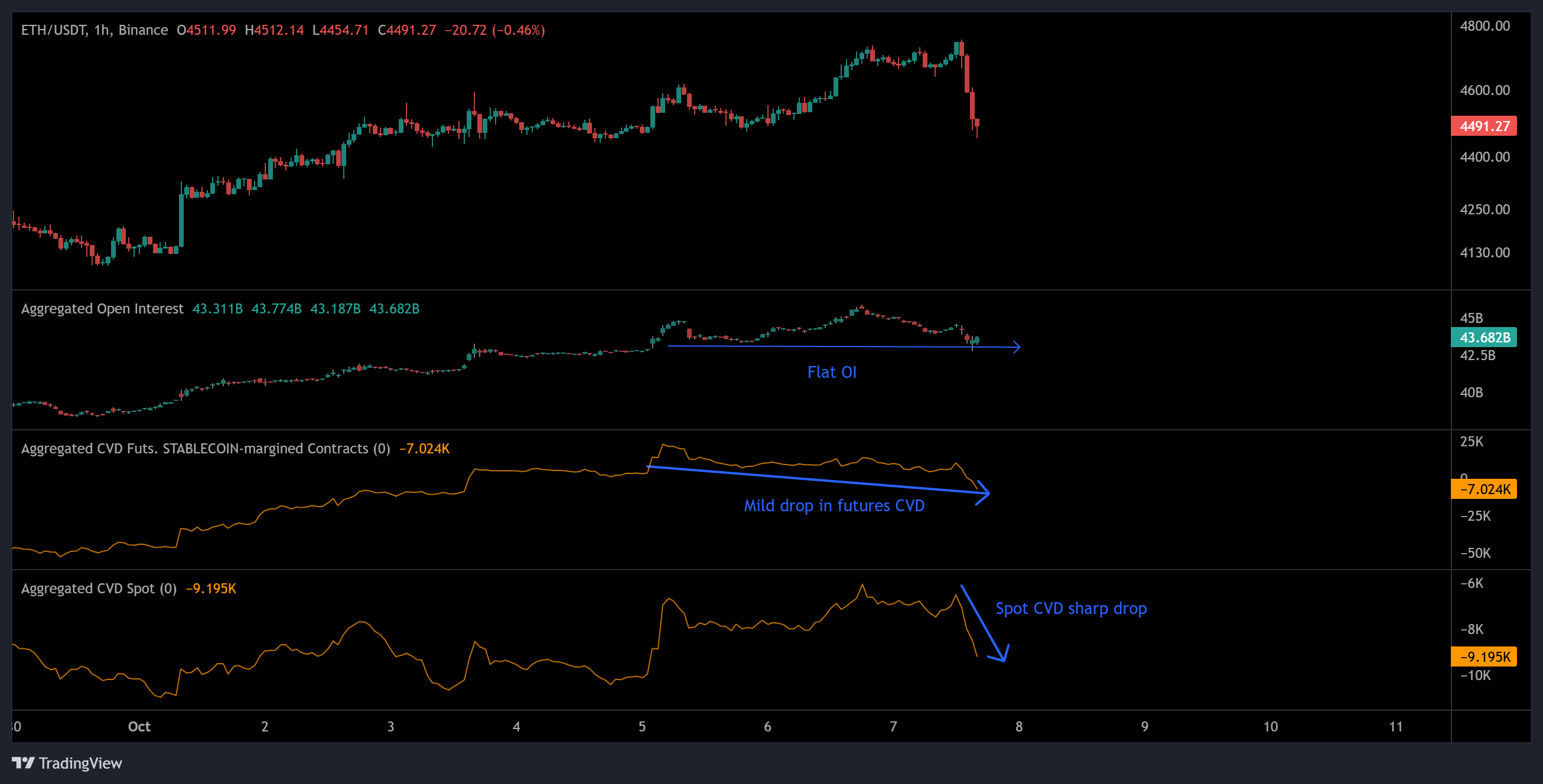 ETH, 4.500 dolar seviyesini yeniden test etti ve zincir üstü ve türev veriler karışık sinyaller gösterdi. Spot kümülatif hacim deltası (CVD) keskin şekilde düşerek spot piyasada net satış baskısına işaret ederken, vadeli işlemler açık pozisyonları ve vadeli işlemler CVD’si yüksek kaldı. Bu durum, spot alıcılar kâr alırken kaldıraçlı yatırımcıların hala aktif olduğunu ve fiyat oynaklığına göre pozisyon aldıklarını gösterdi.