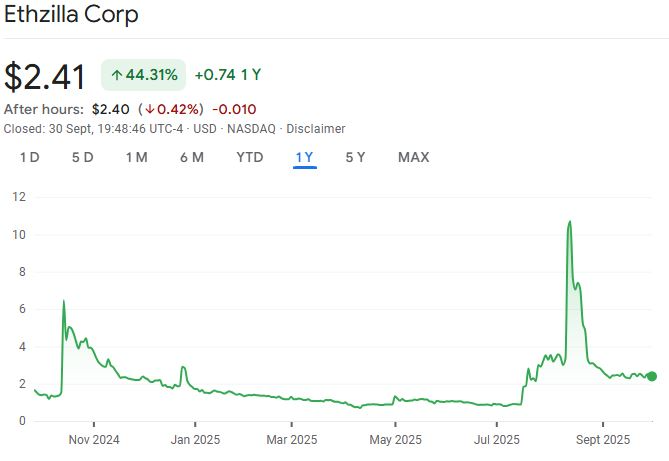 Kriptoya geçişinden bu yana ETHZilla hissesi yılbaşından bu yana yüzde 44 kazanç kaydetti. Kaynak: Google Finance