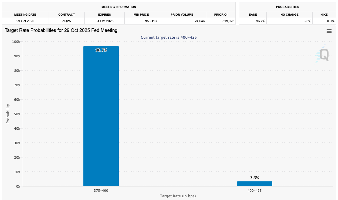 Bununla birlikte, piyasalar Federal Açık Piyasa Komitesi’nin (FOMC) yüzde 0,25’lik bir indirim yapacağından emin. CME Group’un FedWatch Tool verileri olasılığı yüzde 95’in üzerinde gösteriyor.