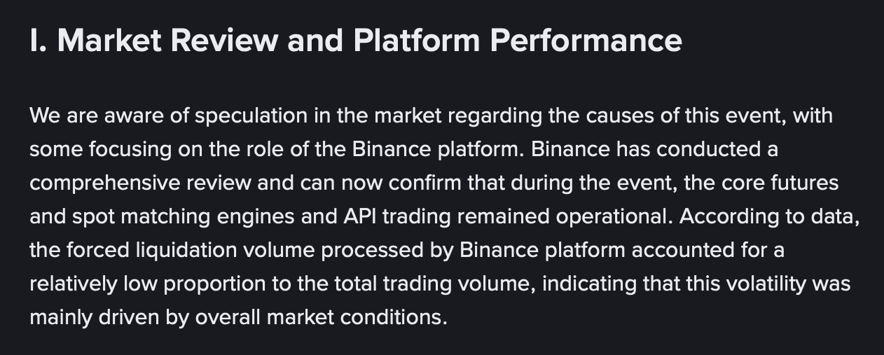 Ayrıca, platformundaki zorunlu tasfiyelerin toplam piyasa faaliyetinin yalnızca küçük bir kısmını oluşturduğunu ve fiyat oynaklığının esas olarak içsel bir arızadan ziyade genel piyasa koşullarından kaynaklandığını belirtti.