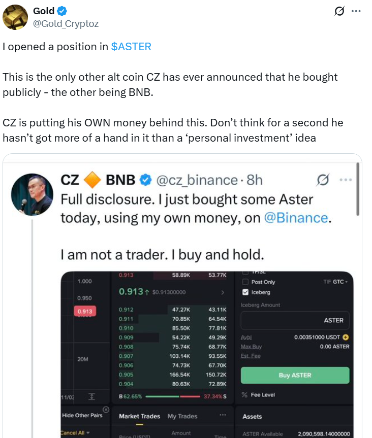 “Gold” kullanıcı adıyla bilinen bir yatırımcı, CZ’nin paylaşımının ardından X’te Aster’de pozisyon açtığını ve bunun CZ’nin BNB dışında bir token satın aldığını ilk kez duyurması olduğunu belirtti.
