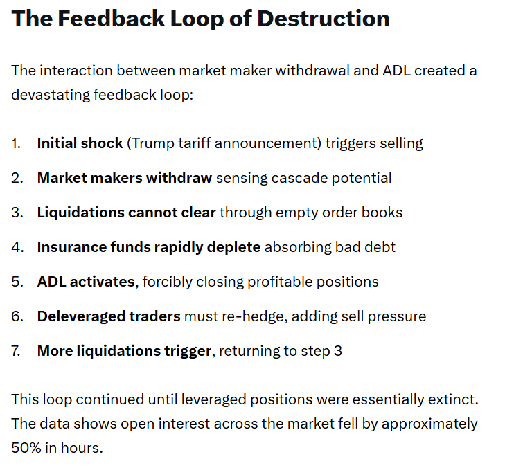 Cuma günkü çöküş sırasında açık pozisyonlarda 14 milyar dolarlık bir düşüş görüldü, ancak blockchain veri platformu CryptoQuant analisti Axel Adler Jr’a göre bu düşüşün en az yüzde 93’ü “kontrollü bir kaldıracın azaltılmasıydı, zincirleme bir etki değil.”