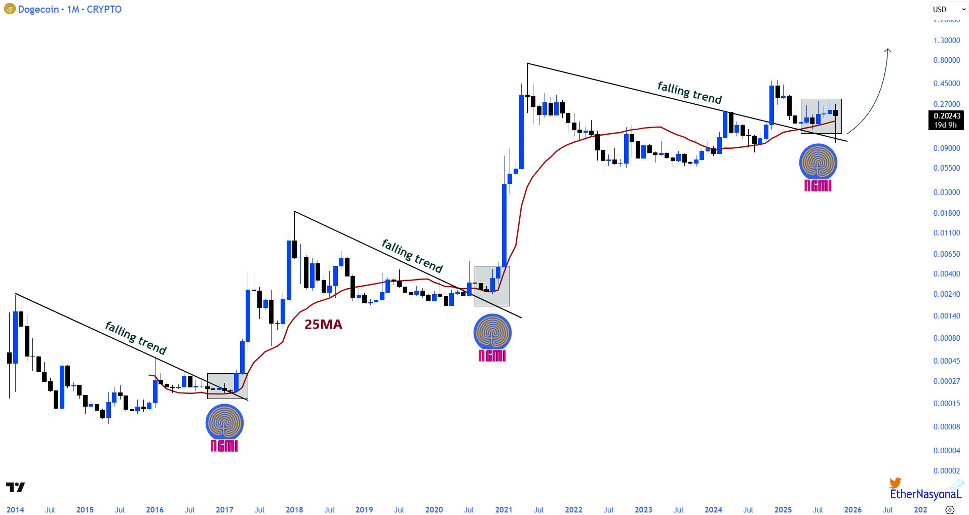 Kripto yatırımcısı EtherNasyonal, tarih boyunca her önemli DOGE rallisinin, 25 günlük hareketli ortalamanın üzerinde kalıcılık sağladıktan, uzun vadeli düşüş trendini kırdıktan ve yeniden test aşamasına girdikten sonra başladığını gözlemledi. Yatırımcı, tüm bu koşulların şu anda mevcut olduğunu belirterek, DOGE’nin büyük yükselişlerini genellikle inançsızlık ve piyasa yorgunluğu koşullarında başlattığını söyledi.
