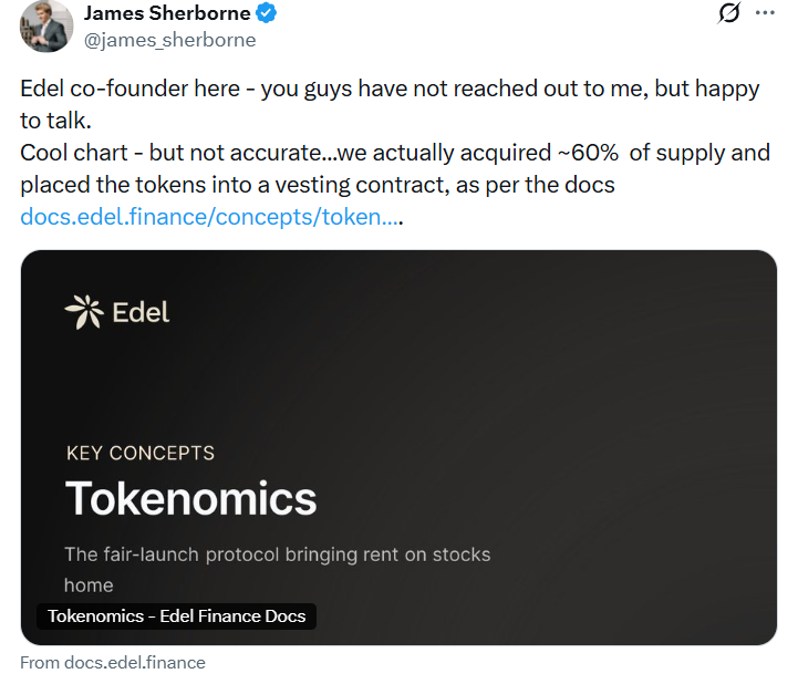 Bulgulara yanıt veren Edel Finance’in kurucu ortağı James Sherborne, ekibin token arzının yüzde 60’ını edinmeyi planladığını ve bunun daha sonra token hakediş sözleşmelerine kilitlendiğini söyledi.
