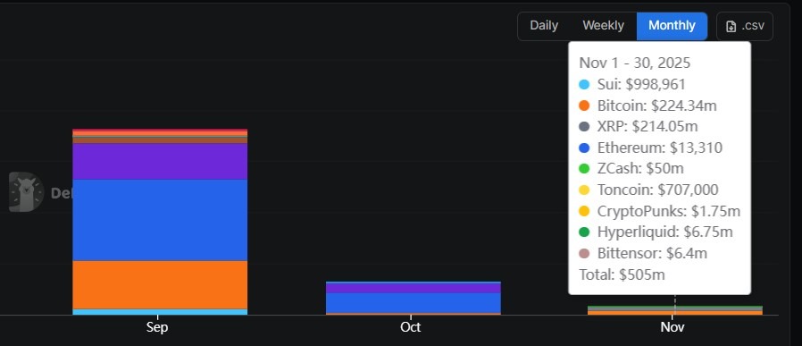 Kasım ayında girişler daha da azaldı. Pazartesi itibarıyla, DAT girişleri bu ay yaklaşık 500 milyon dolara ulaşarak ekime kıyasla yüzde 75 düşüşe işaret etti.