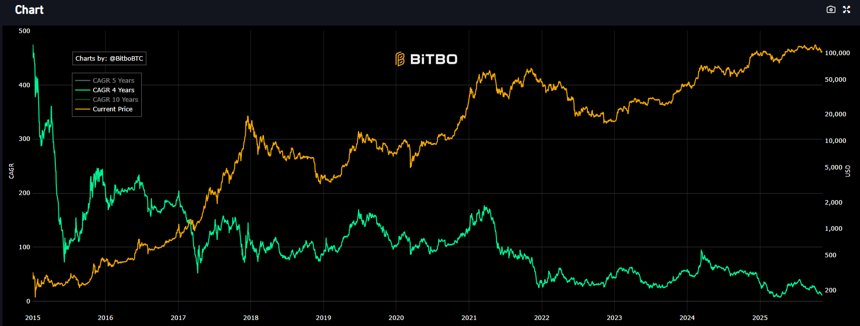 Bitcoin’in dört yıllık CAGR’ı istikrarlı biçimde düşüyor. Kaynak: Bitbo