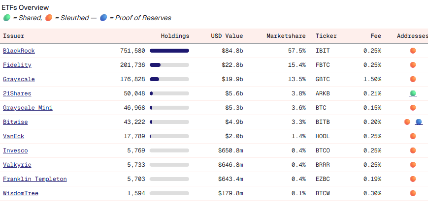 Pazar payına göre Bitcoin ETF’leri. Kaynak: Dune.com