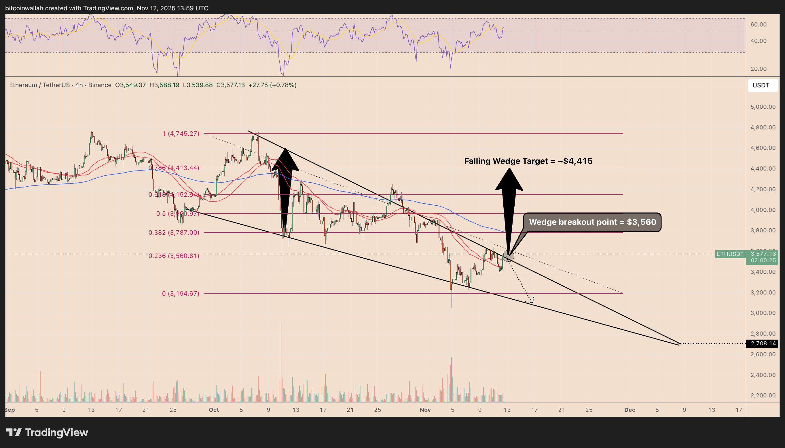 Ether, düşen takoz formasyonundan çıkmaya yaklaşıyor ve hedef 4.400 dolar.
