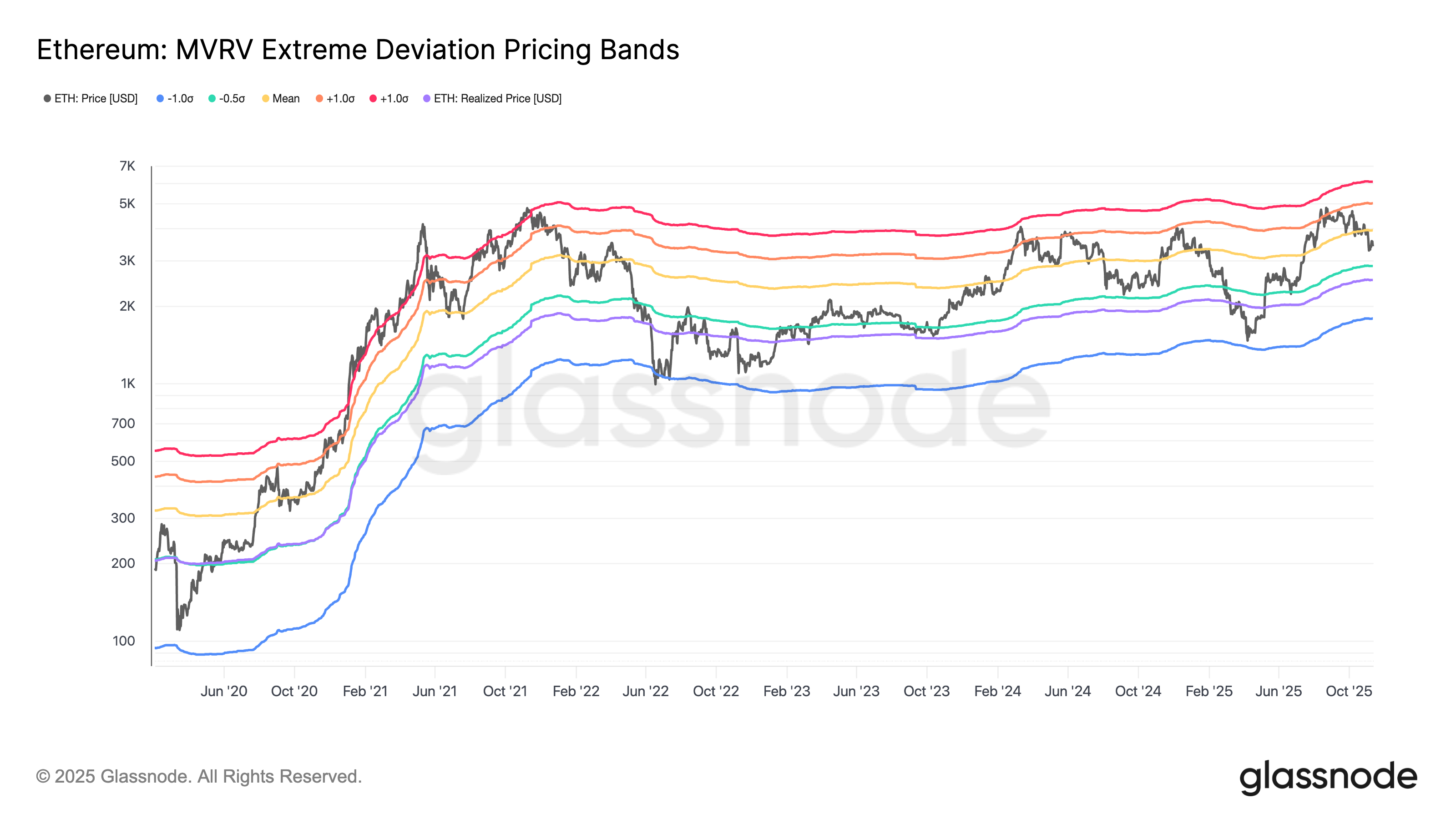 Ethereum’un MVRV Aşırı Sapma Fiyat Bantları, aşağı yönlü bir görünüme işaret ediyor ve ETH’nin ortalama değerleme seviyesinin altında kapanmasının ardından yaklaşık 2.870 dolar civarındaki –0,5σ bandına (turkuaz) düşebileceğini öne sürüyor.