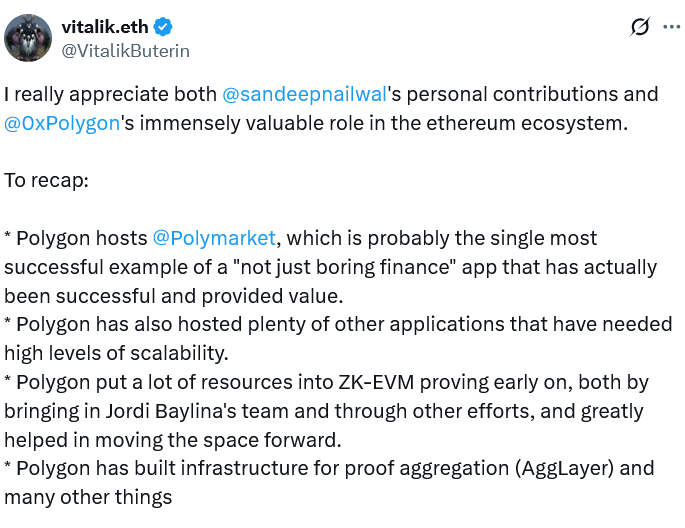 Gönderisi, Ethereum kurucu ortağı Vitalik Buterin’in, Polygon’un daha geniş Ethereum topluluğundaki başarılarını kabul ettiği bir yanıt vermesine yol açtı.