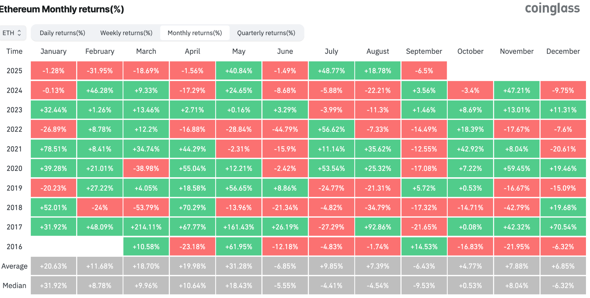 ETH/USD aylık getiriler. Kaynak: CoinGlass
