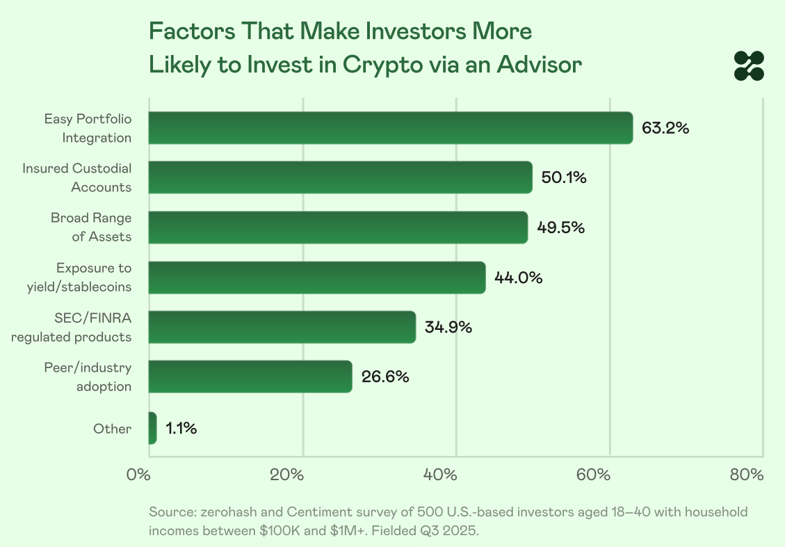 Zerohash, anket sonuçlarına dayanarak danışmanların yatırımcı kazanmak için uygulaması gereken stratejinin kriptoyu “geleneksel varlıklarla aynı panelde” sigortalı saklama ile sunmak olduğunu söyledi.