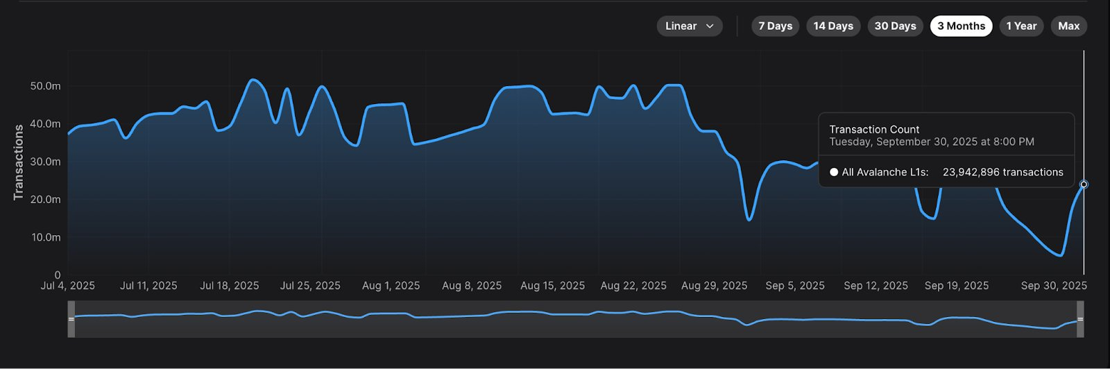 Nansen’e göre Avalanche’ın zincir üstü verileri, kullanıcı etkinliğinde önemli bir artışa işaret ediyor. Ağ, günde ortalama 1 milyonun üzerinde işlem gerçekleştirirken, geçtiğimiz çeyrekte günlük 51,6 milyon işlemle zirveye ulaştı.