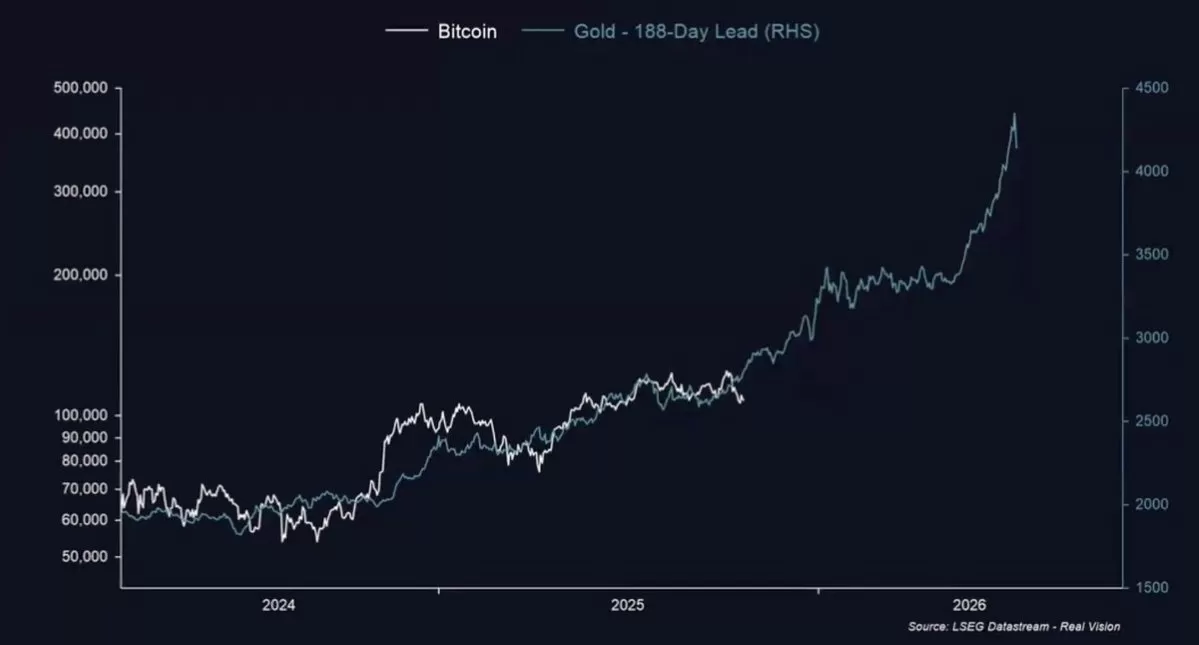 LSEG Datastream ve Real Vision verilerine dayanan grafikte, 2024–2026 dönemi boyunca Bitcoin ve altın oranları karşılaştırılıyor. Bitcoin’in çizgisi, zaman farkına rağmen altının ayarlanmış eğrisi üzerinde yer alıyor.