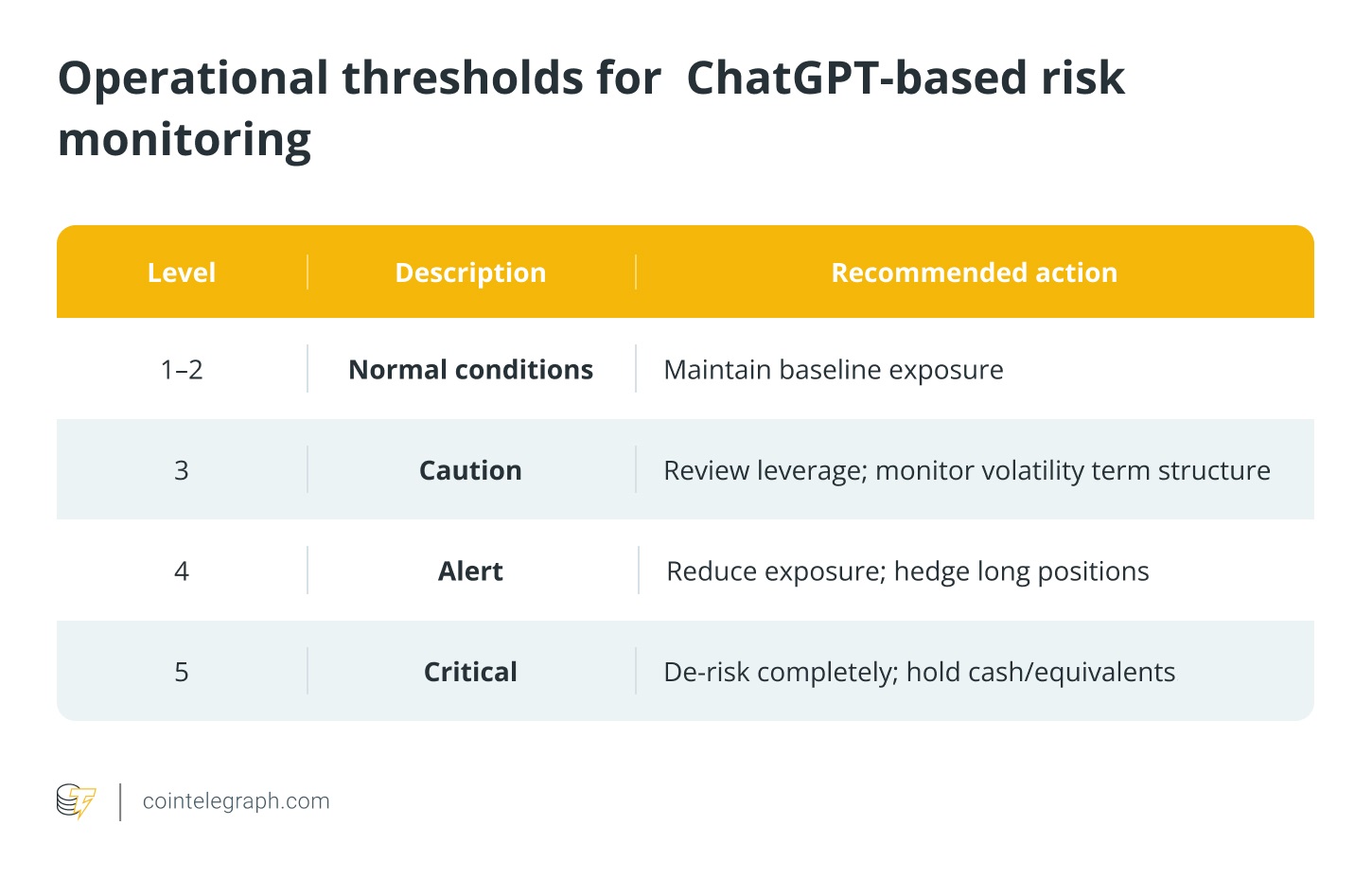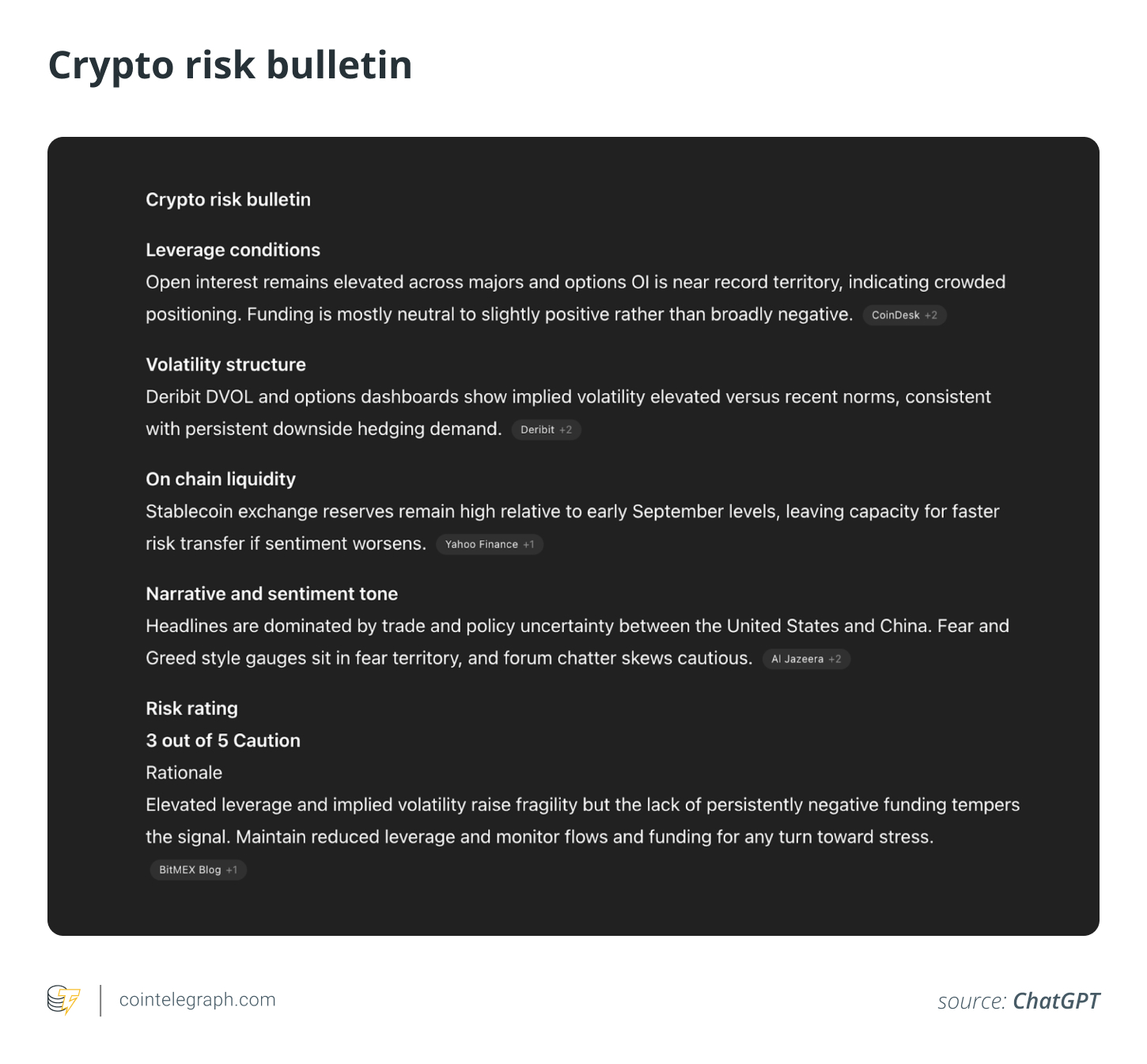 “Bir kripto piyasa risk analisti gibi davran. Sağlanan verileri kullanarak kısa bir risk bülteni oluştur. Mevcut kaldıraç koşullarını, fiyat oynaklığı yapısını ve baskın duyarlılık tonunu özetle. Sonuçta kısa bir gerekçeyle 1-5 arasında bir risk notu (1=Düşük, 5=Kritik) ata.”
