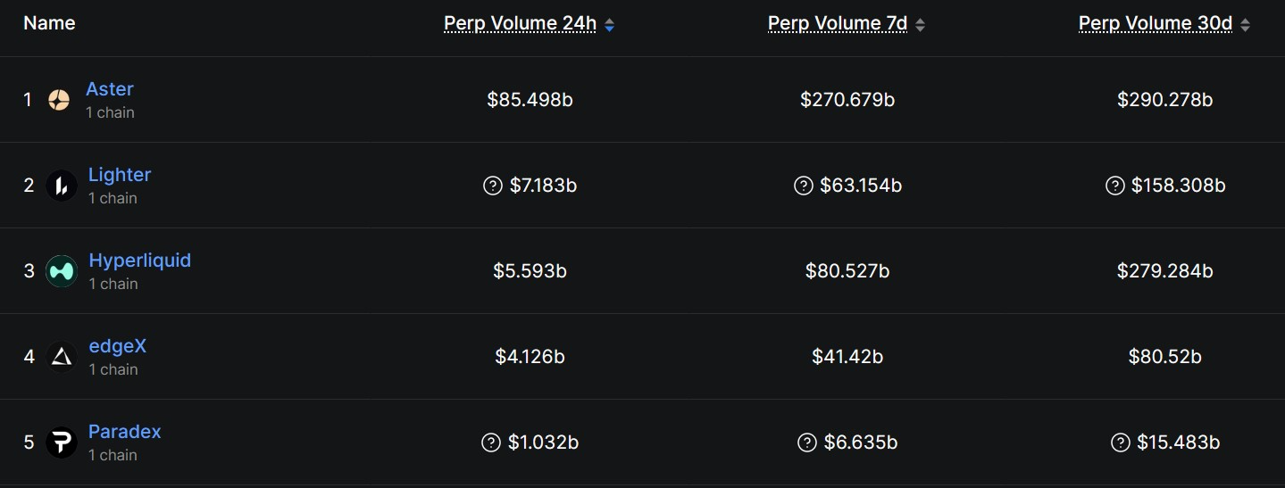 Pazartesi günü DefiLlama, Aster’ın 24 saatlik işlem hacminin 85 milyar dolara sıçradığını gösterdi. Bu rakam, en yakın rakibi Lighter’ın aynı günkü hacminin 12 katından fazlaydı.
