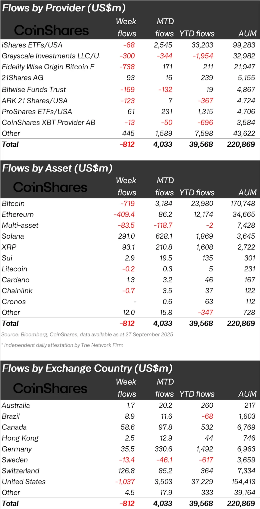 Bu hafta Ekim ayının başlamasıyla XRP, Solana (SOL) gibi altcoinler için ETF kararları beklenirken CoinShares haftalık kripto para raporunu yayınladı ve geçtiğimiz hafta 812 milyon dolarlık çıkış yaşandığını söyledi.