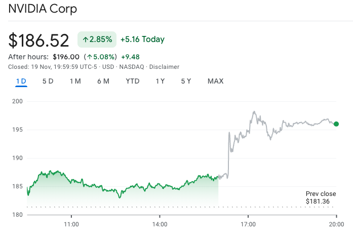Nvidia (NVDA) hisseleri, çarşamba günkü işlemleri yüzde 2,85 artışla 186,52 dolarda kapattıktan sonra mesai sonrası işlemlerde üçüncü çeyrek kazançlarının ardından yüzde 5’in üzerinde yükselerek 196 dolara çıktı.