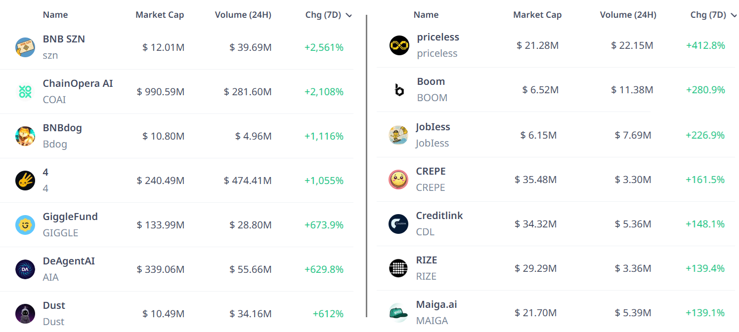 BNB Chain tokenlerinin haftalık en iyi performansları. Kaynak: Cryptorank.io