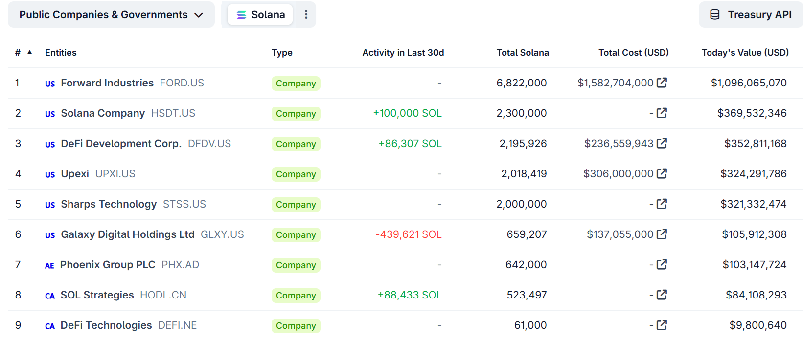 Galaxy Digital Holdings’in (GLXY) 439 bin 621 SOL satışı, Solana’nın kurumsal rezerv stratejisinin sürdürülebilirliği konusunda endişe yarattı. Forward Industries (FORD) ise 6,82 milyon SOL ile en büyük pozisyona sahip ve CoinGecko verilerine göre bu rakam son 30 gün içinde sabit kaldı.