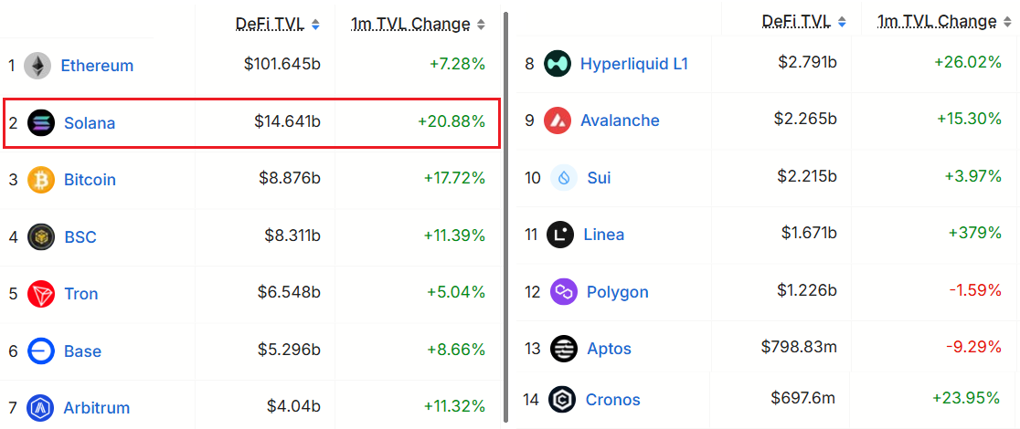 Ethereum, şu anda 101,6 milyar dolarda olan geniş kapsamlı toplam kilitli değeri (TVL) sayesinde kurumsal tahsislerde hakim olmaya devam ediyor. DefiLlama verilerine göre Solana, 14,6 milyar dolar ile ikinci sırada yer alıyor. Ancak SOL, yüzde 6,8’lik staking getirisi ile Ether’in yüzde 2,9’unun oldukça üzerinde bir getiri sunarak öne çıkıyor. Bu üstün getiri, yeni gelenler için belirleyici bir faktör olabilir.