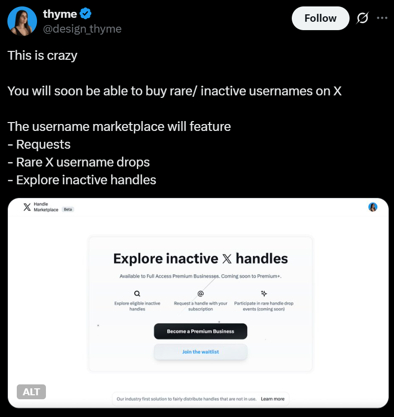 Şu anda beta aşamasında olan pazar yeri, kullanıcıların yaklaşan kullanıcı adı açılış etkinlikleri için bekleme listesine katılmasına, Premium abonelikleri aracılığıyla kullanıcı adı talep etmesine ve uygun etkin olmayan hesaplara göz atmasına olanak tanıyor. Şirket bunu yalnızca ücretli abonelere sunulan “artık kullanılmayan kullanıcı adlarının yeniden dağıtılması için bir çözüm” olarak tanımladı.
