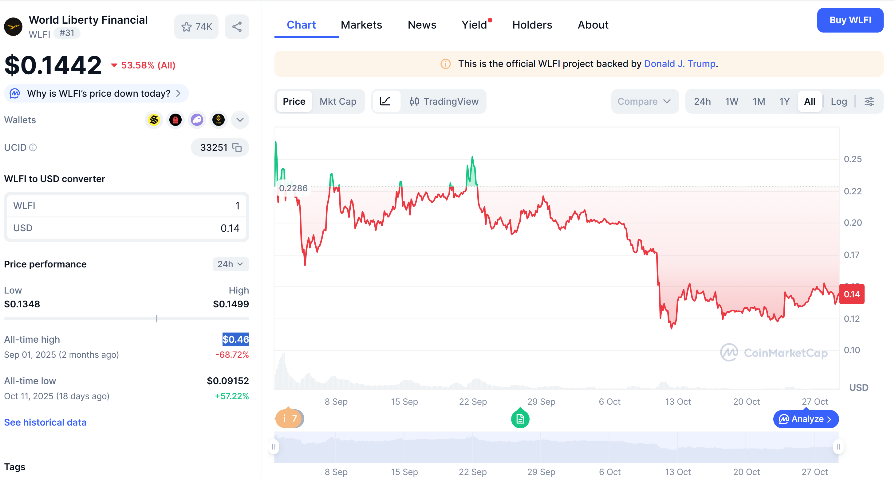 WLFI şu anda 0,14 dolardan işlem görüyor ve son 24 saatte yüzde 0,5 düşüş kaydetti. CoinMarketCap verilerine göre token, eylül ayında kaydedilen 0,46 dolarlık tüm zamanların en yüksek seviyesinden yaklaşık yüzde 70 aşağıda.